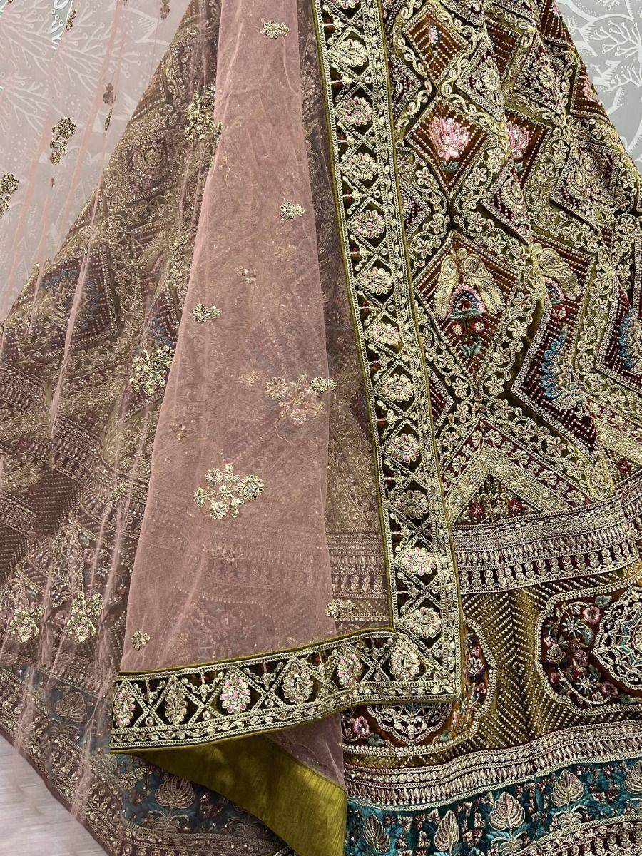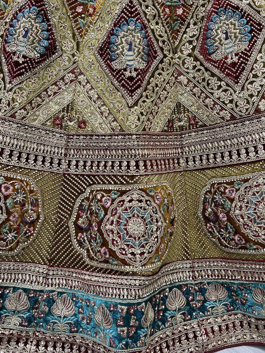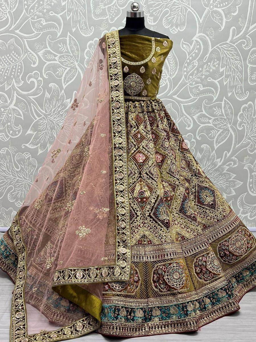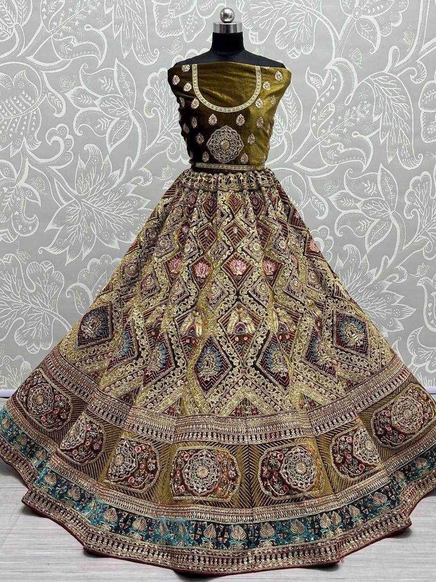 Discover elegance with our mesmerizing Mehendi Green Velvet Bridal Lehenga, perfect for your most cherished moments. Intricately crafted with multi-thread embroidery, it radiates luxury and grace.