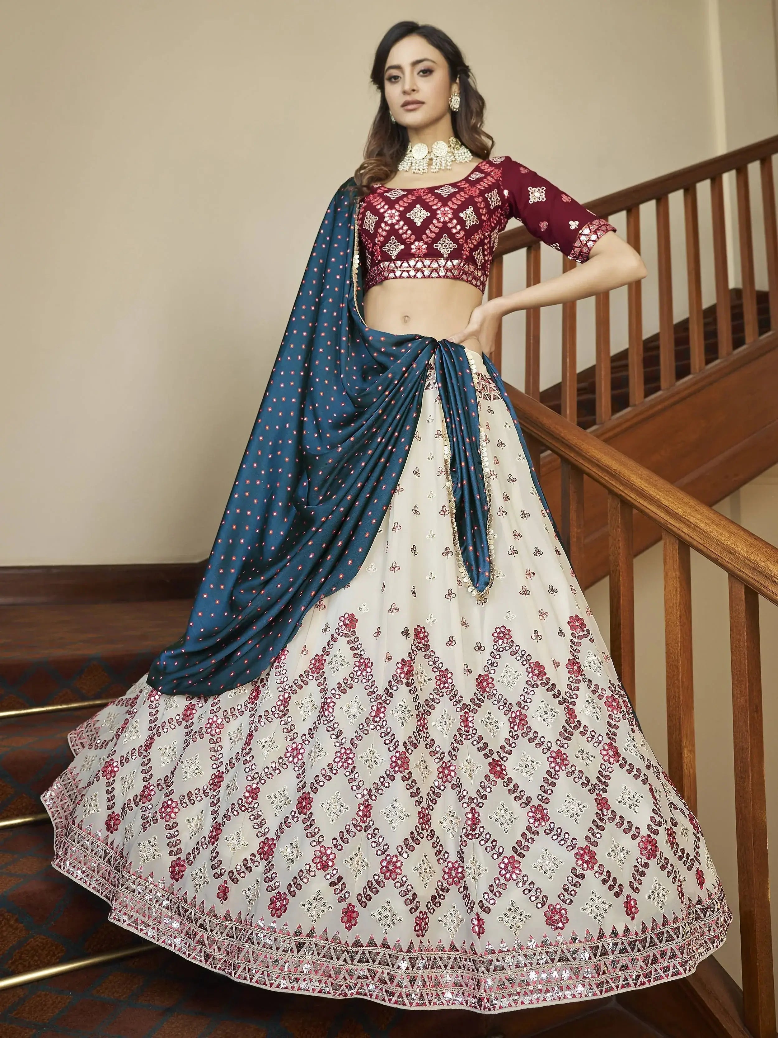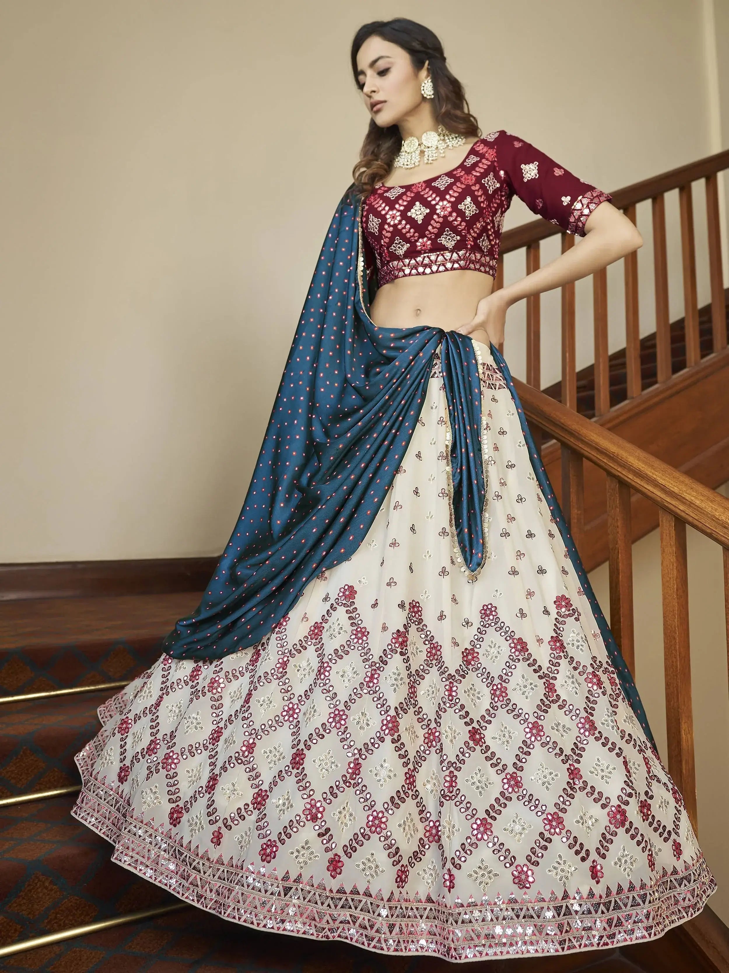 This lehenga comes with a maroon color choli in georgette material with gota patti, sequin, thread embroidery work all over and a teal blue crepe silk dupatta featured with printed work.
