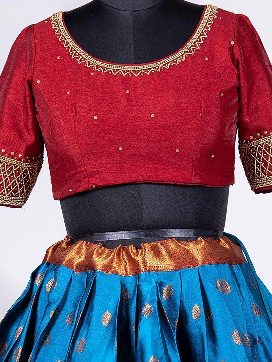 Drape this traditional attire this festival season , in blue and red color pattu lehenga you can go with it at any function and festival.