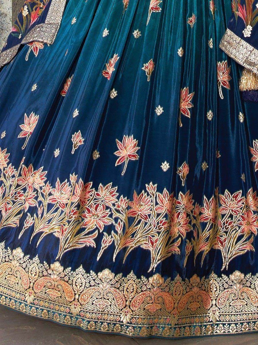 The lehenga is made from high-quality silk material, ensuring both comfort and durability. The blue color adds a touch of elegance, making it perfect for weddings, receptions, engagements, and other special occasions. The intricate zari weaving work adds a glamorous touch, enhancing the overall beauty of the lehenga.
