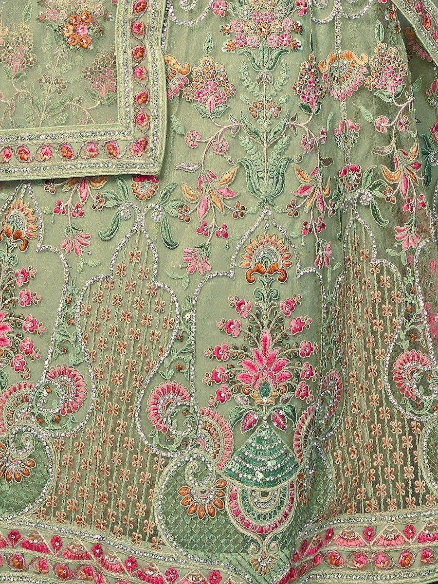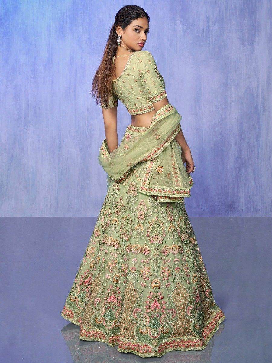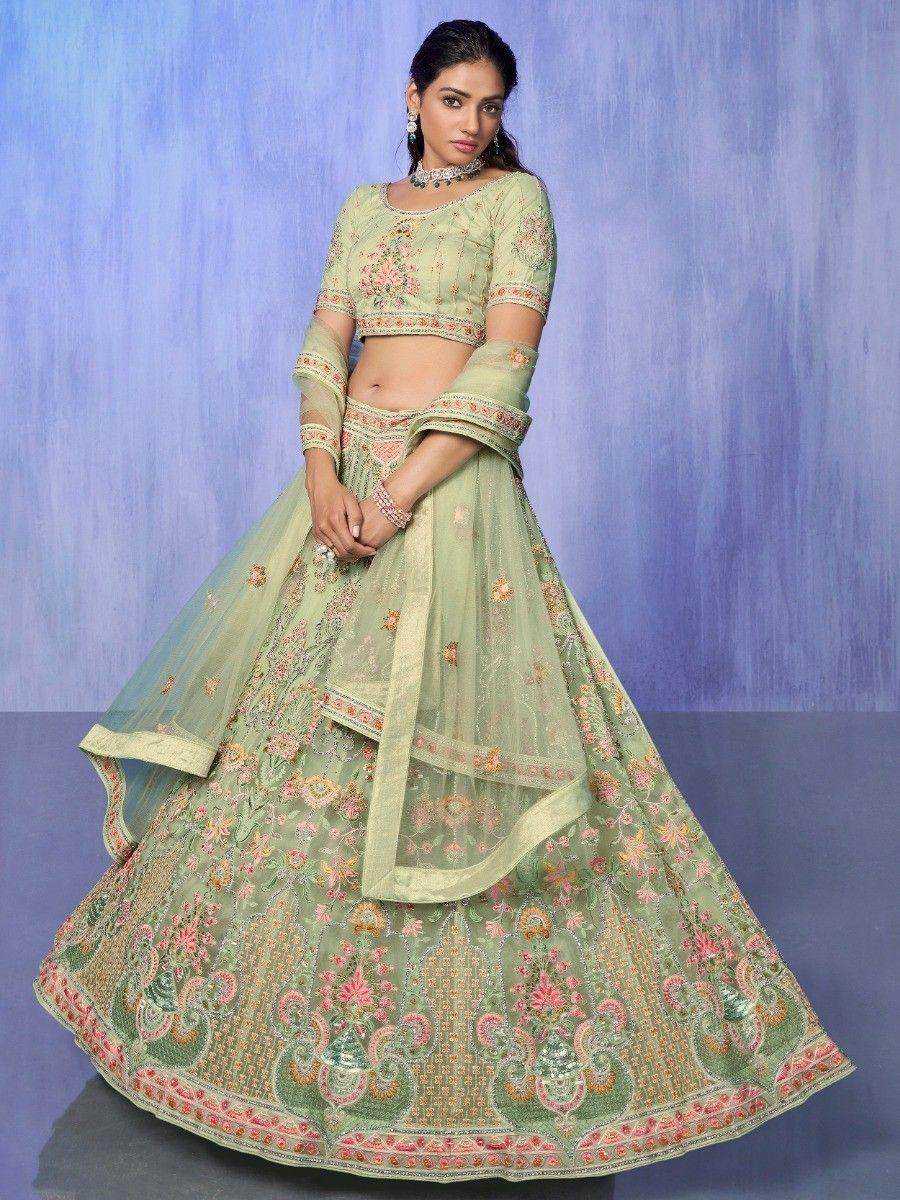 At weddings and engagements, every woman desires to make a remarkable fashion statement, and our wonderful green embroidered net wedding lehenga choli with dupatta is here to fulfill that desire. Crafted with precision and elegance, this beautiful net lehenga choli set is designed to give you the best look possible.