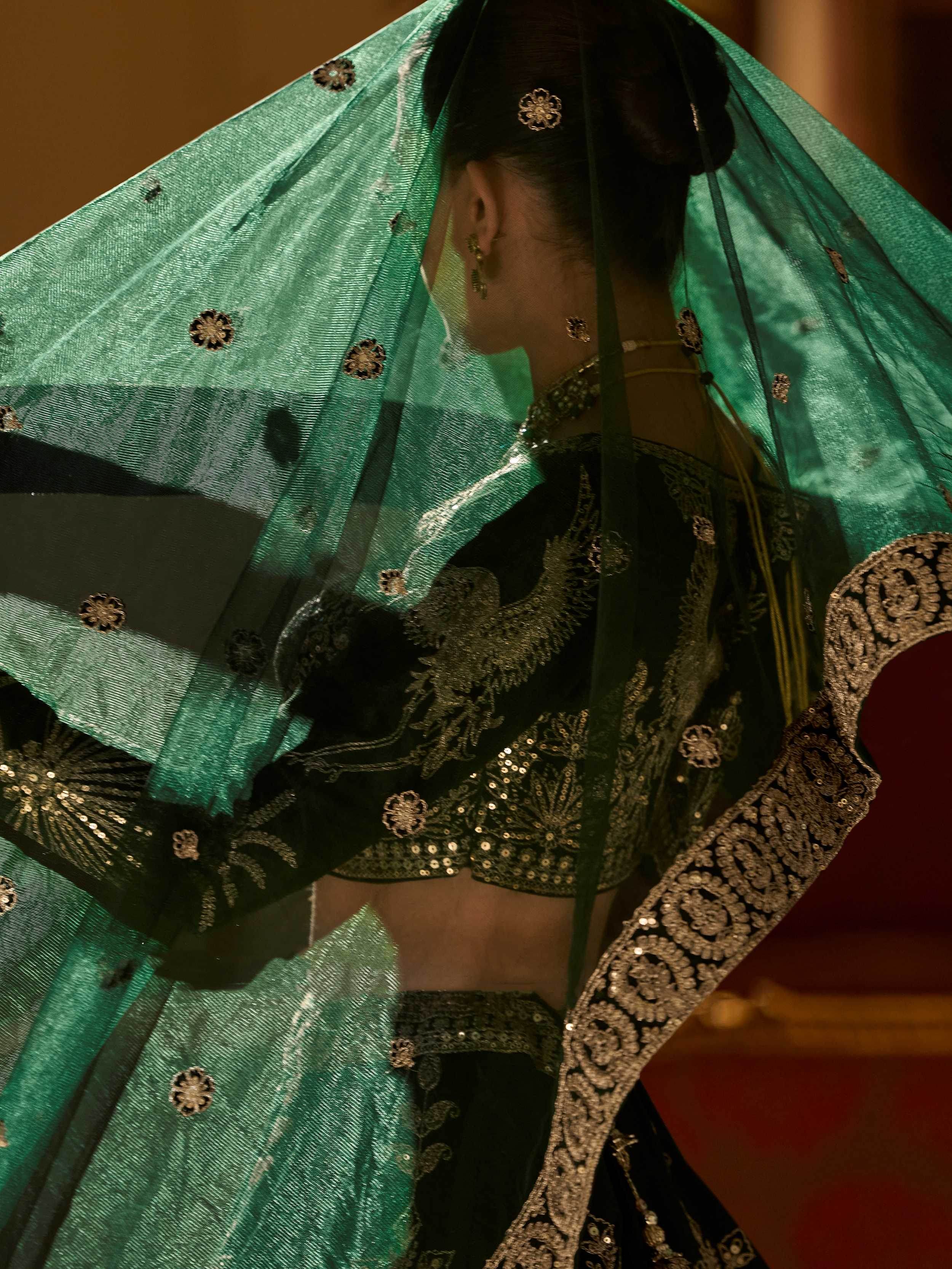 The lehenga features a rich, deep green silk base, adorned with luxurious sequins and zari embroidery throughout. Intricate traditional motifs and a heavily embellished hemline add grandeur and royal elegance to the flowing silhouette.
