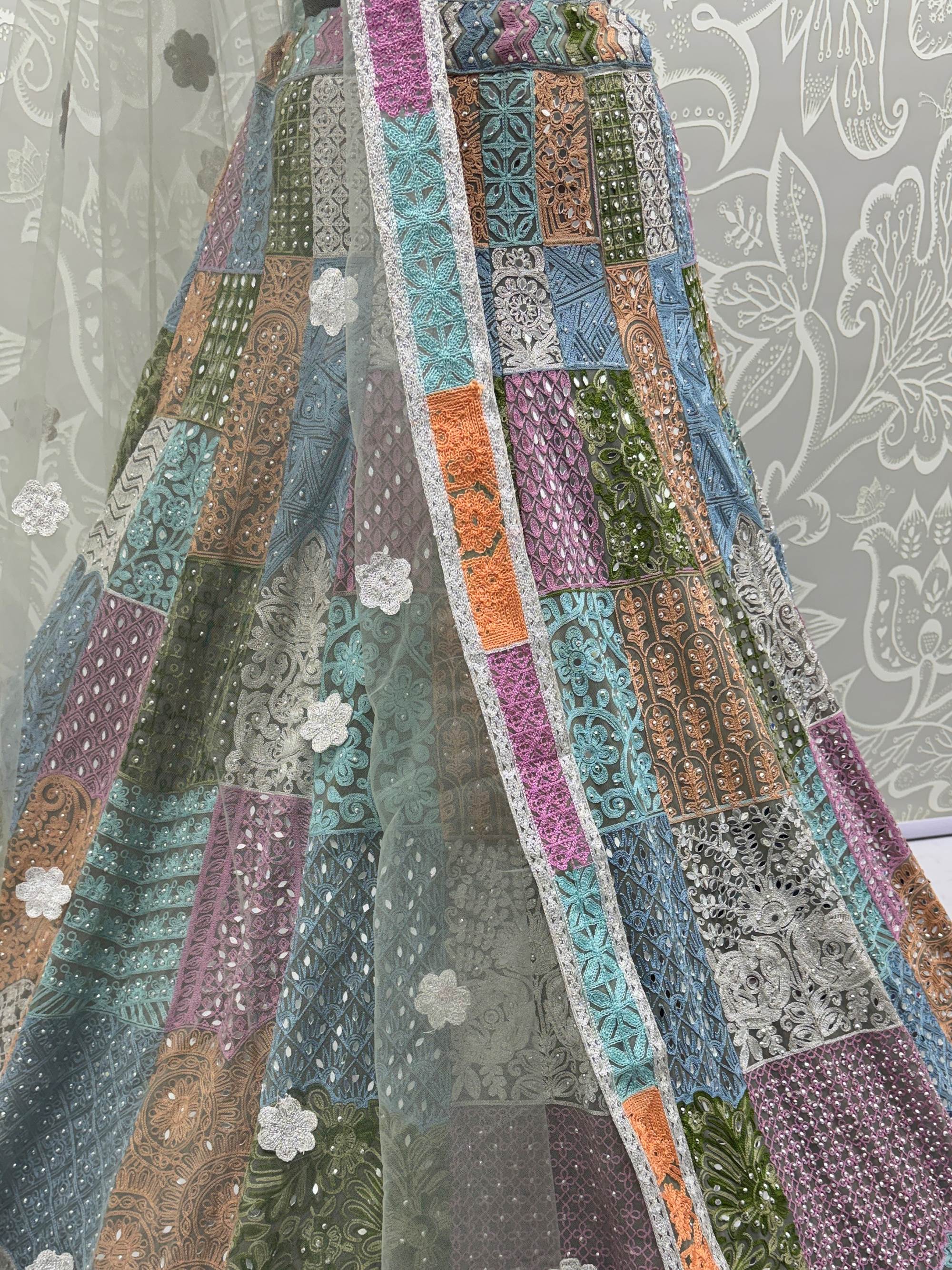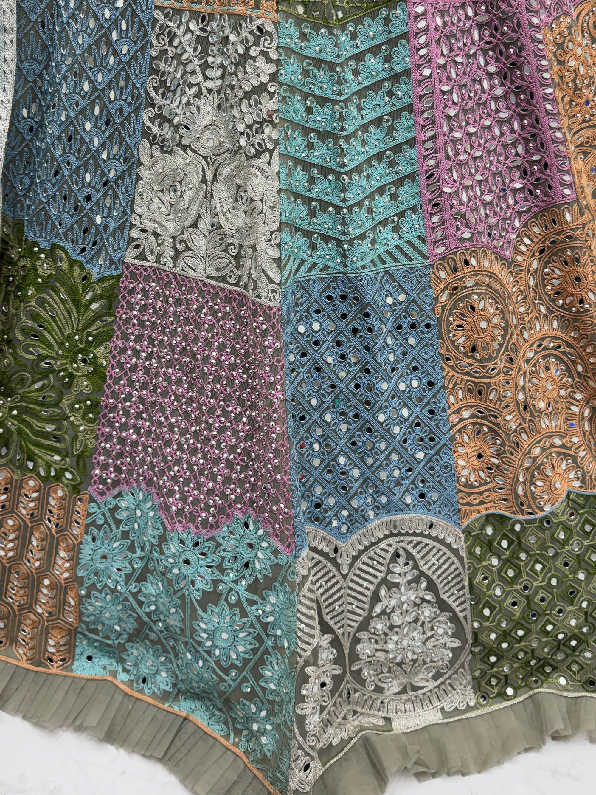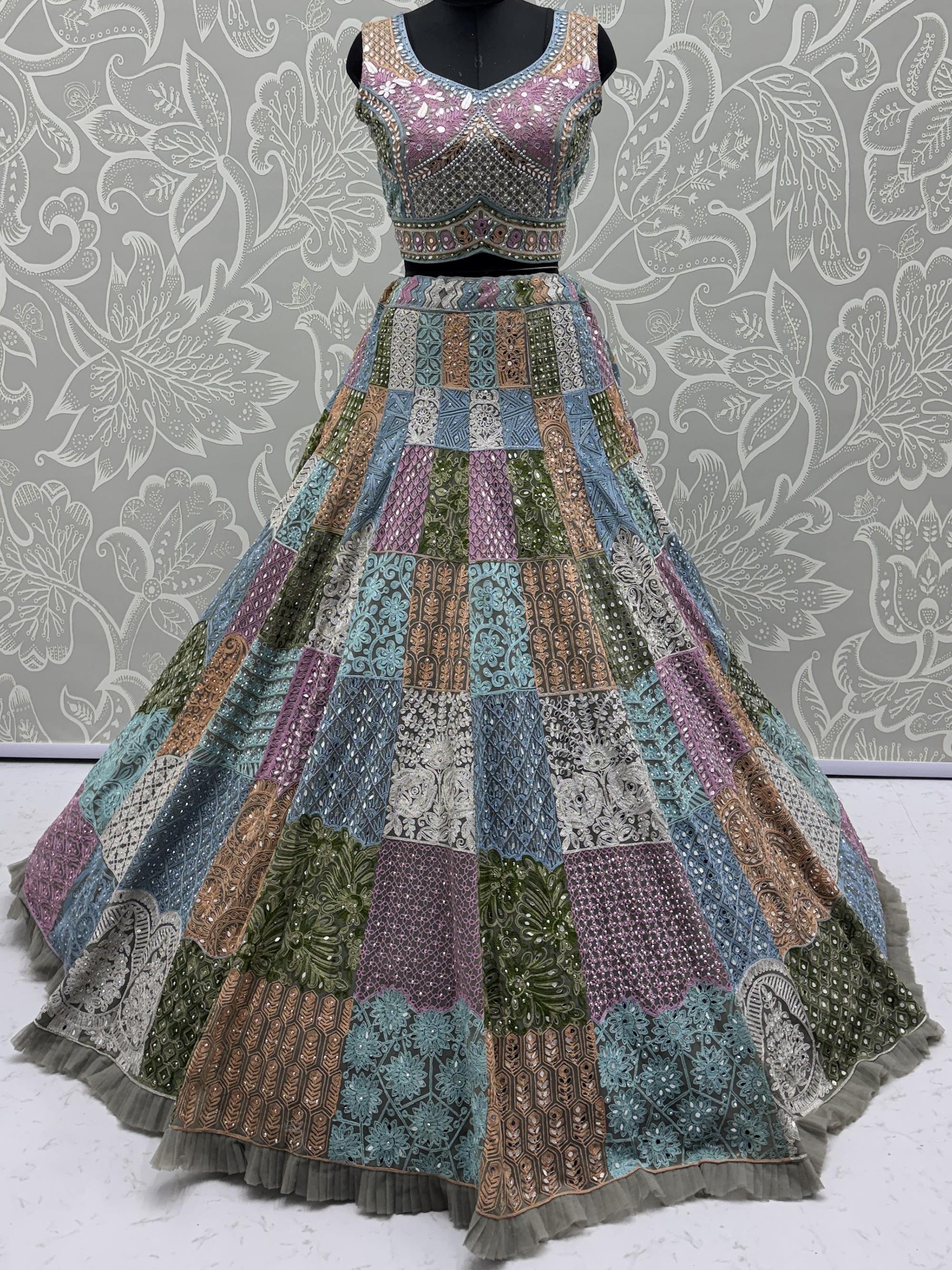 This is a premium, ready-made designer lehenga choli crafted using fine net fabric with real mirror work, chain embroidery, and diamond detailing. The multicolored patchwork pattern gives it a couture, royal, and richly handcrafted appearance.