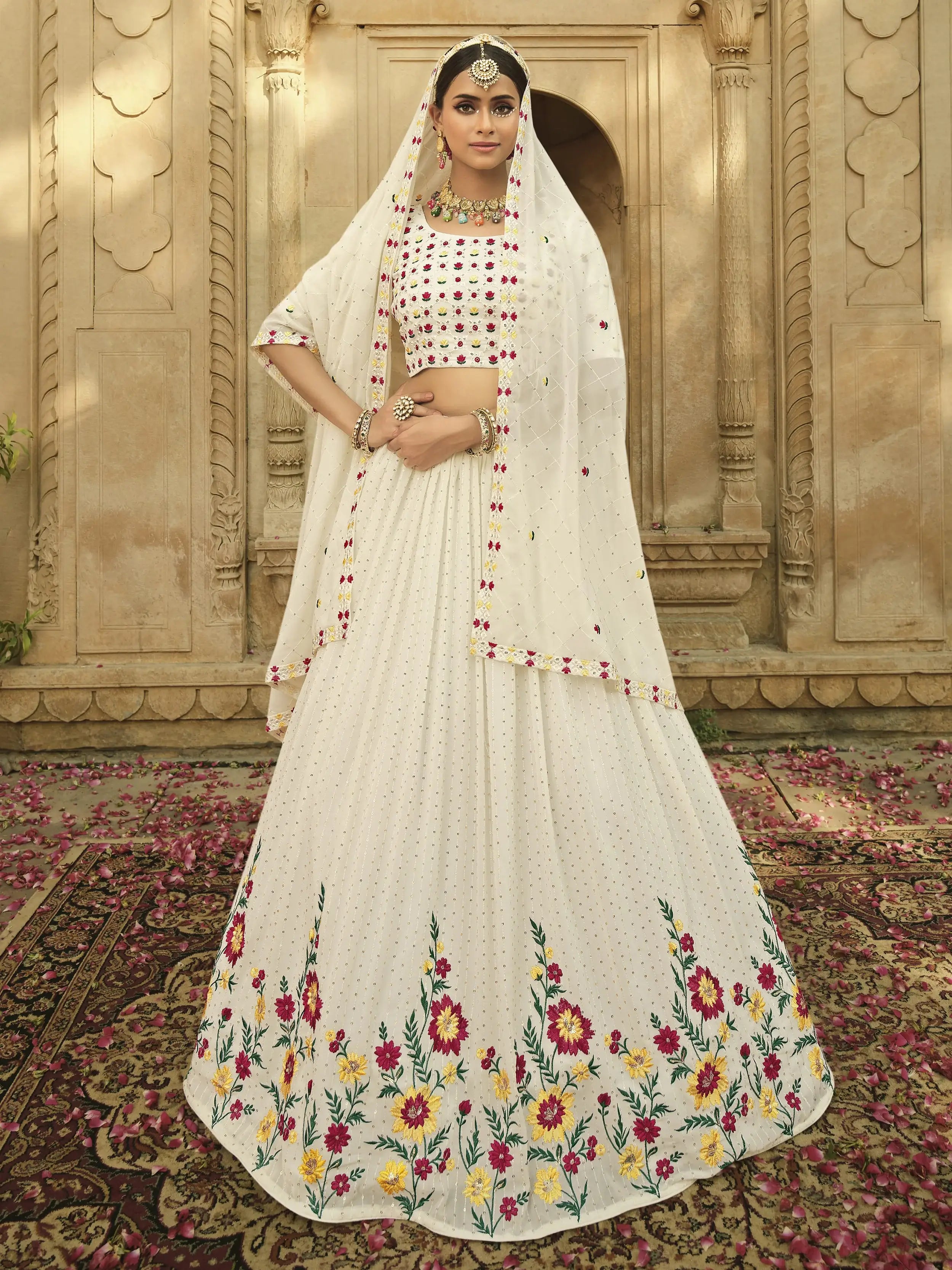 Everyone will admire you when you wear this elegant off-white colored georgette material lehenga achieved with charming multi-color thread and sequins embroidery.