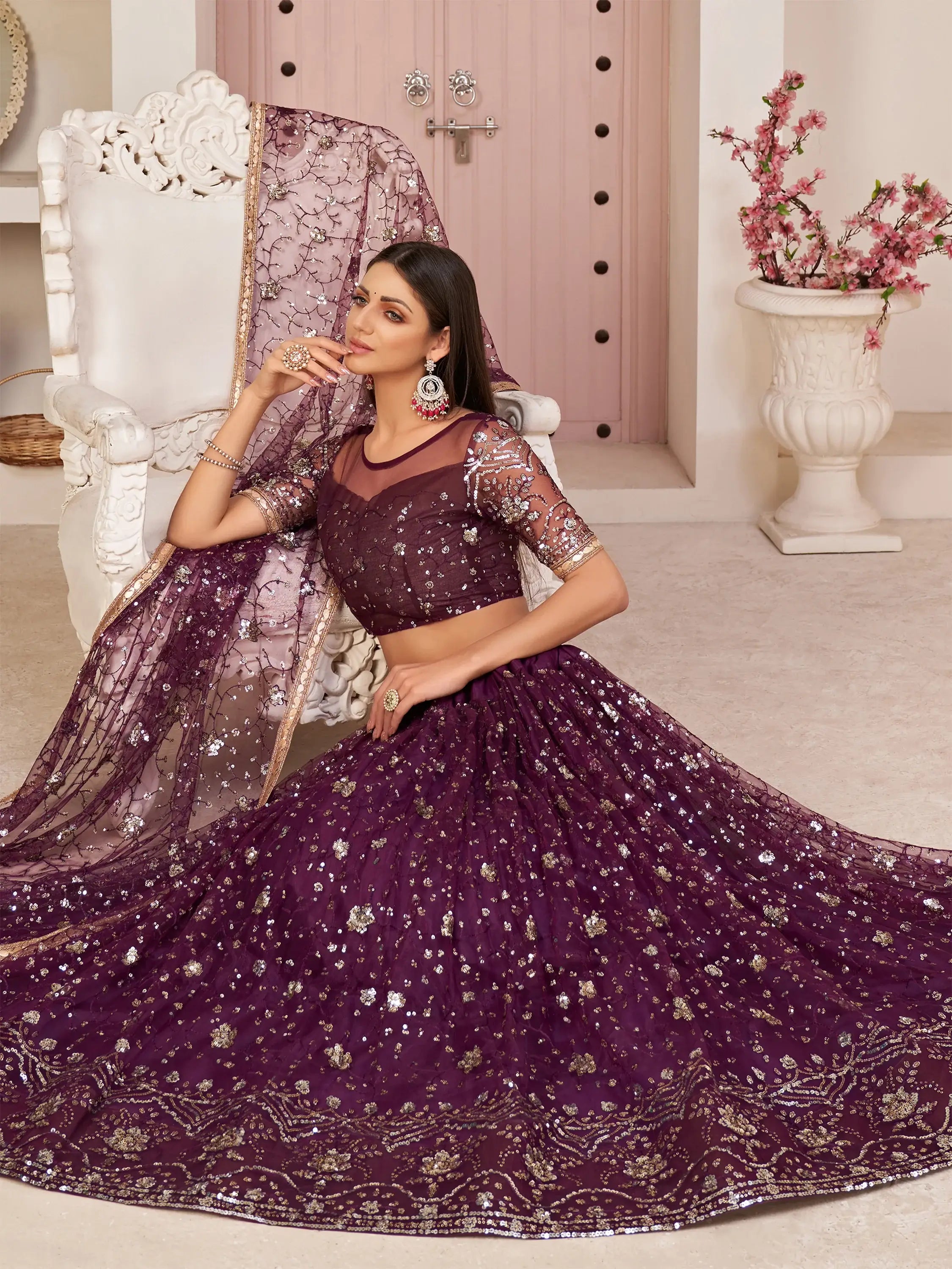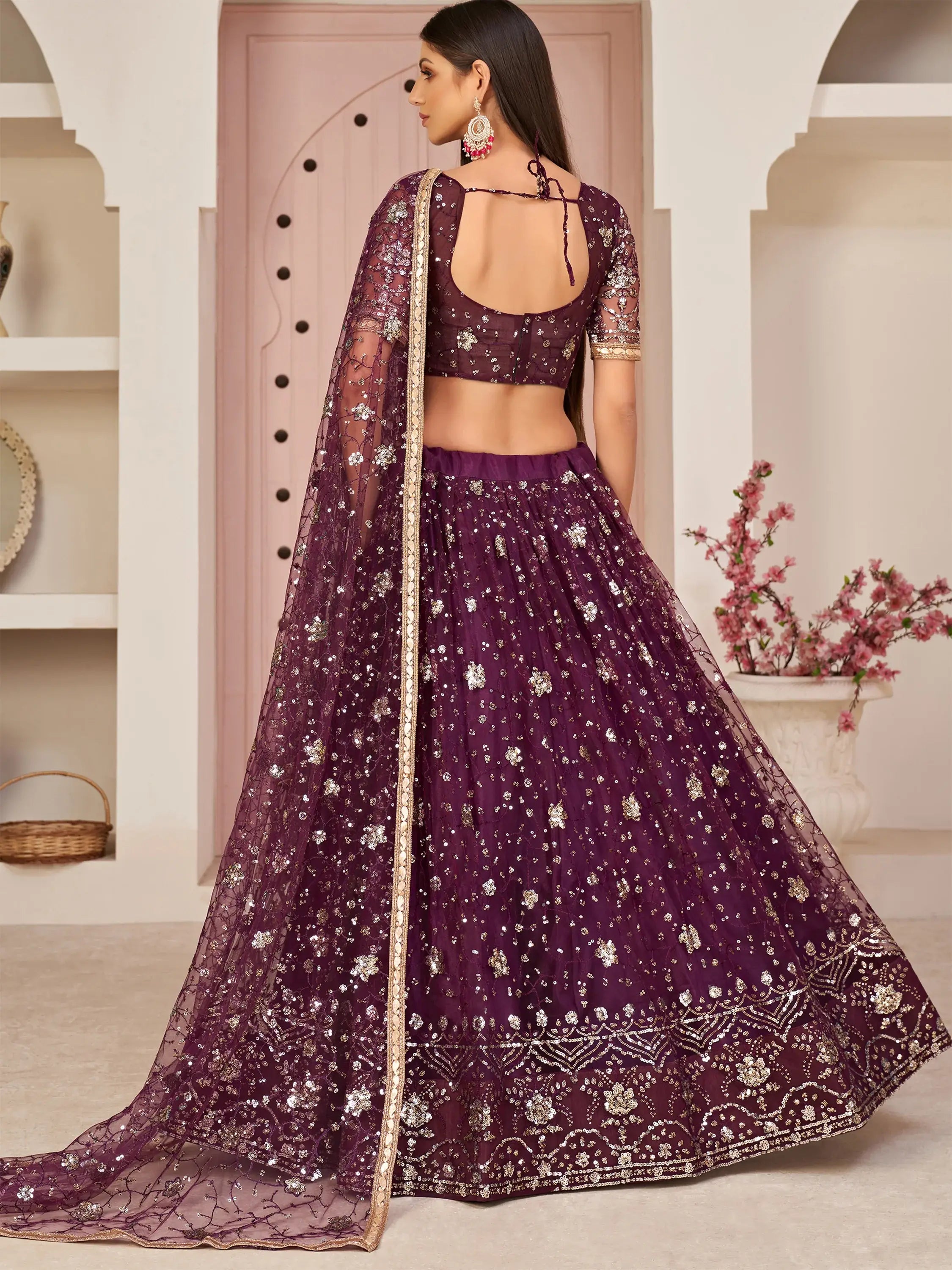 Get a contemporary yet modern look by wearing this striking wine color lehenga made of mono net material embellished with thread embroidery, zari, and sequins work all over featured with attached can-can and canvas.
