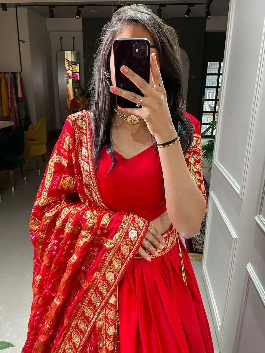 This Featured red lehenga paired with matching color choli crafted on malai silk with sequins and zari work on sleeves with a beautiful bandhej bandhani dupatta in red color zari weaving work and sequins thread work lace border